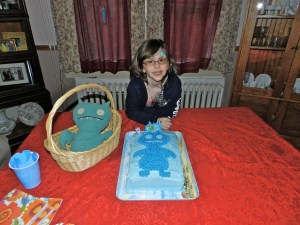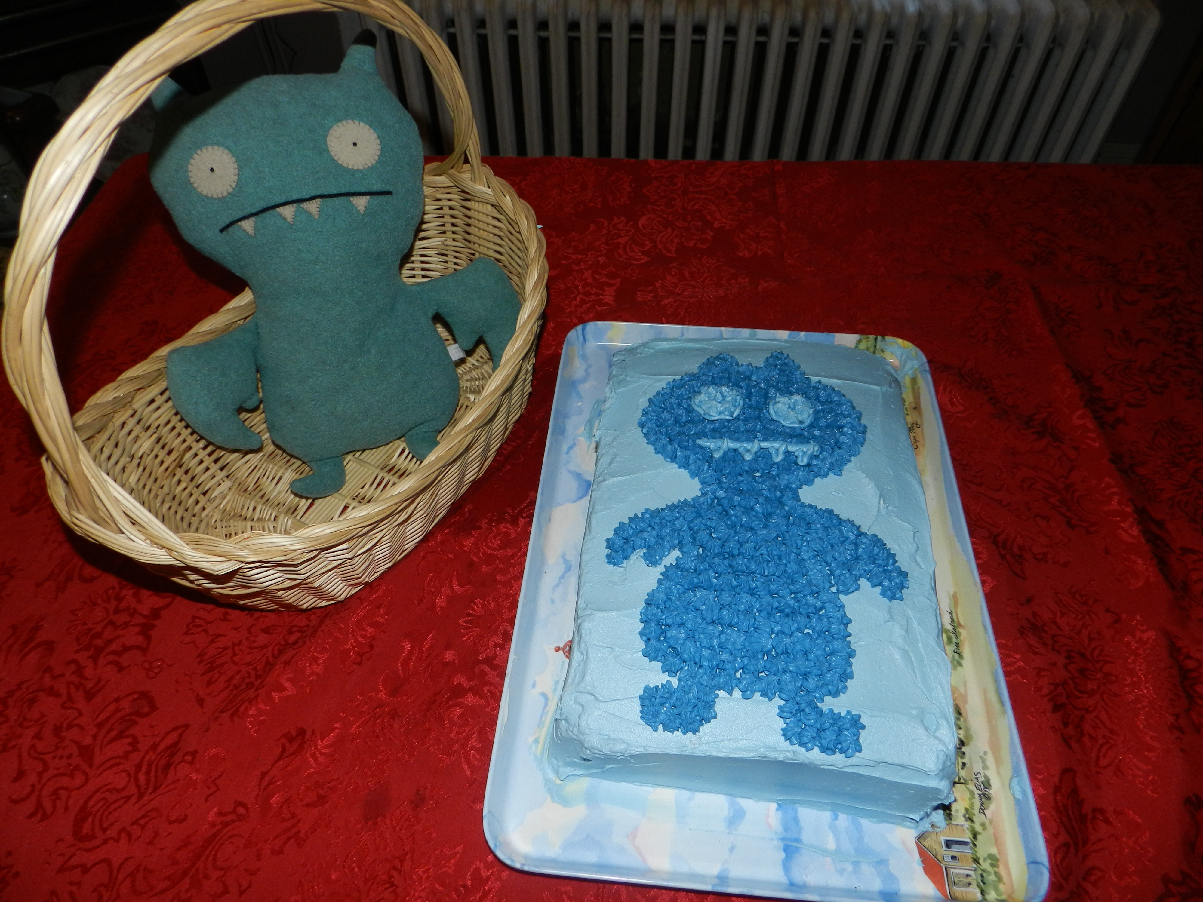 Grace had wanted an Ugly Doll cake for her birthday. Unfortunately Wilton does not make an Ugly Doll Cake Pan so I was on my own. Worked out pretty good though… I think… My husband drew the outline with a toothpick and I filled it in.