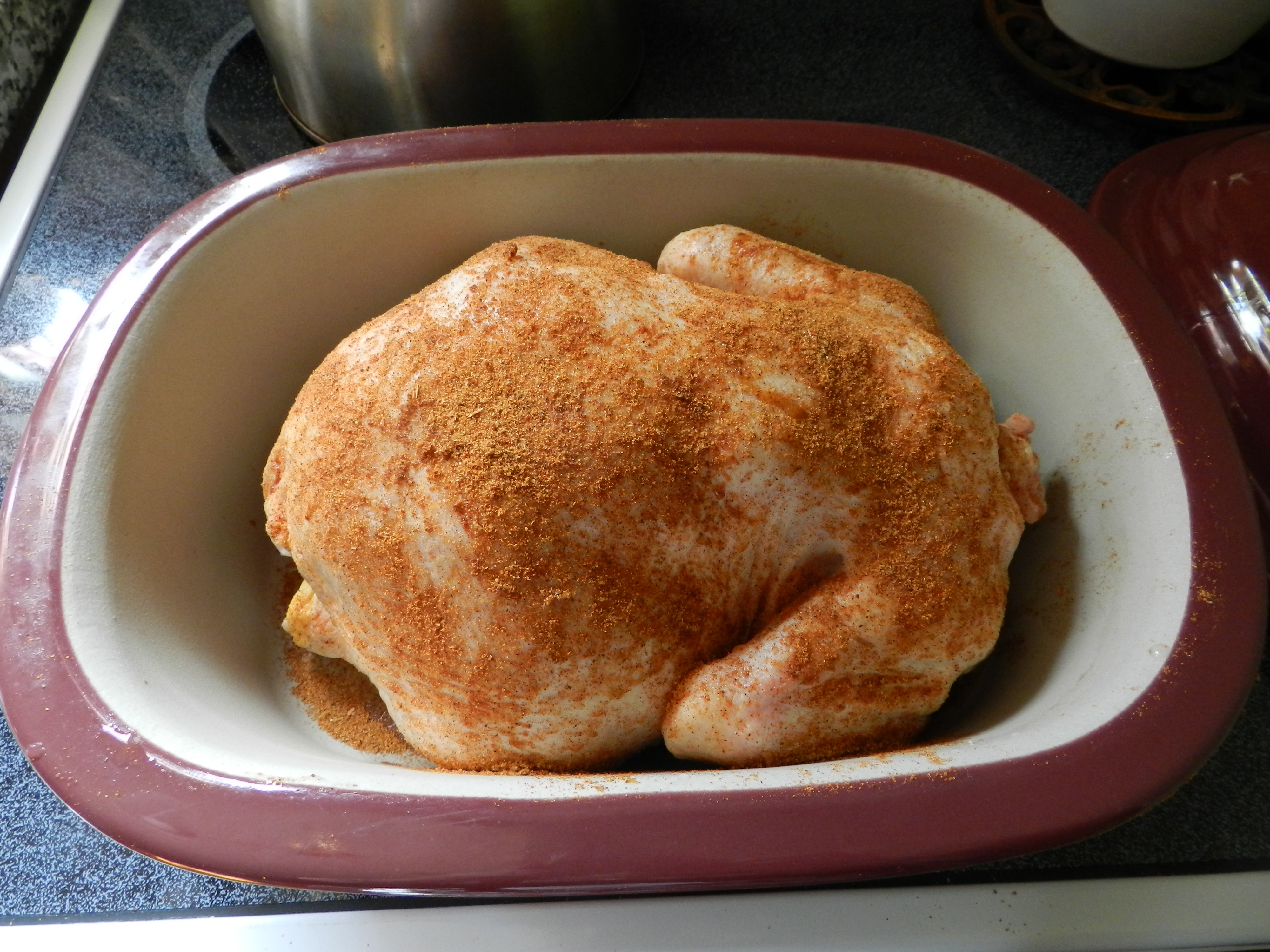 From the sink I plunked it right into the Magic Deep Covered Baker. I sprinkled the chicken with McCormick chicken seasoning- again didn’t’ have any idea what kind of seasoning to choose. I basically just closed my eyes and grabbed one.
