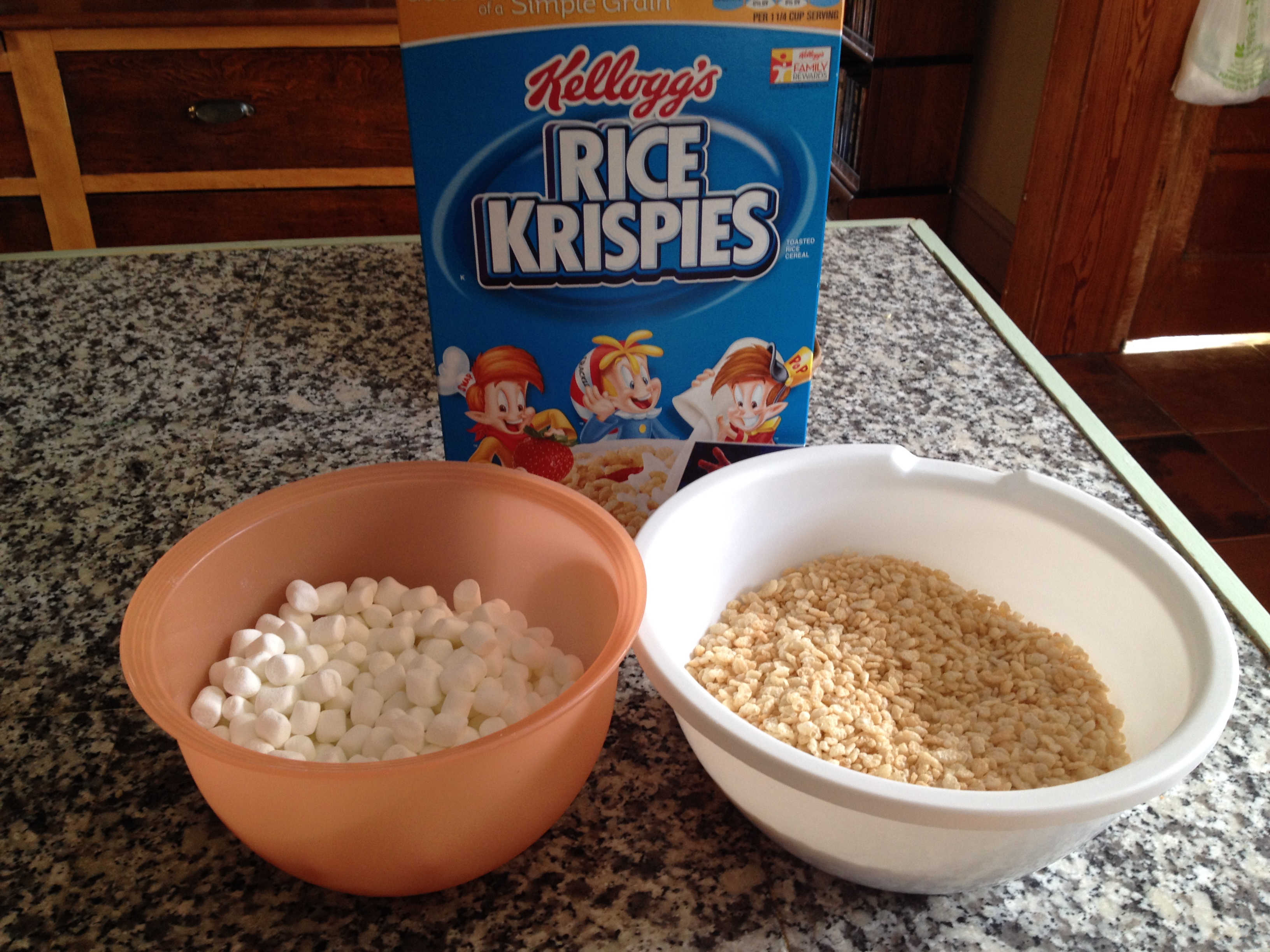 - Measure out 6 cups of Rice Krispies and set aside in a bowl.