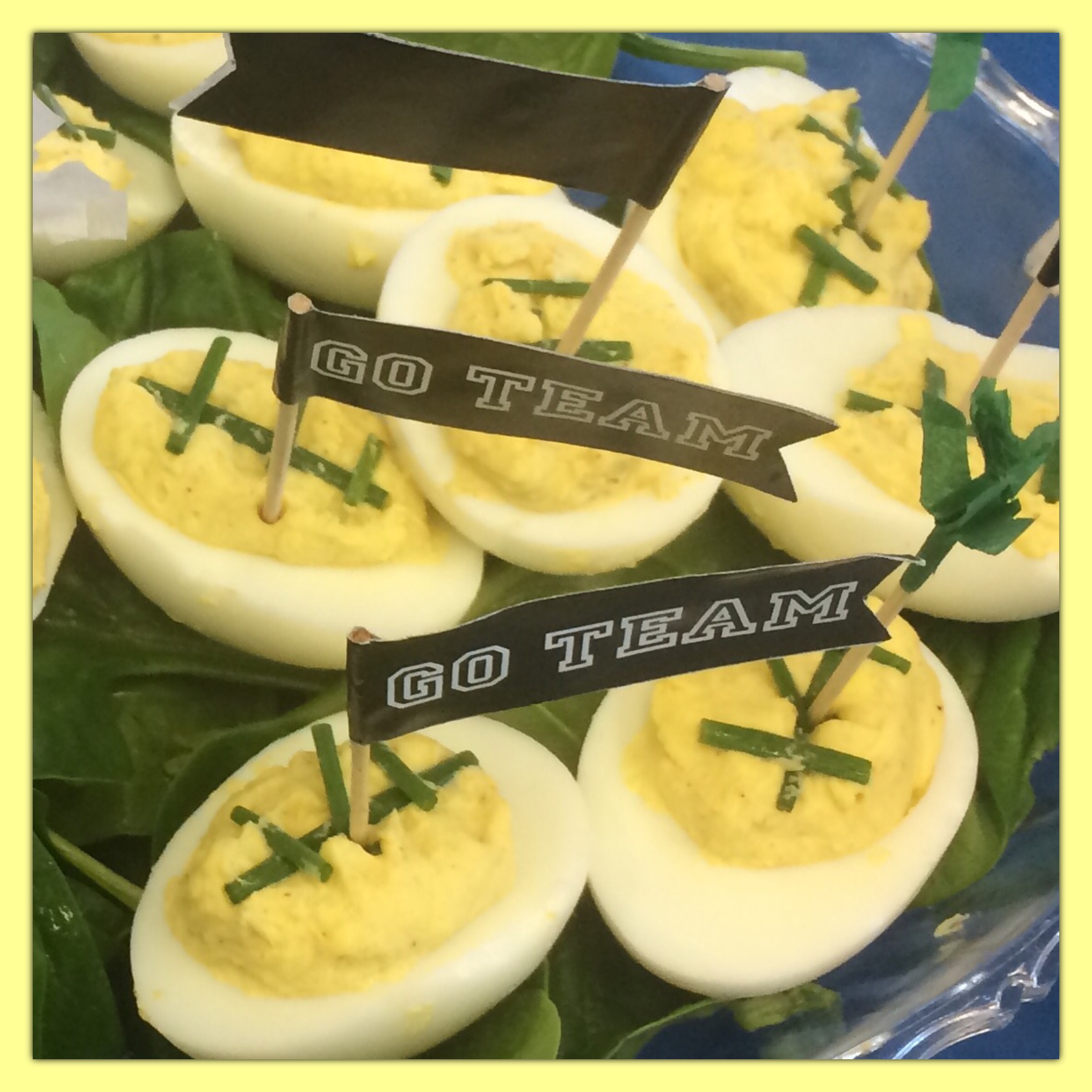 Finally place cut chives over the yolk mixture to look like the laces of a football. A perfect hors d’oeuvres for Superbowl.