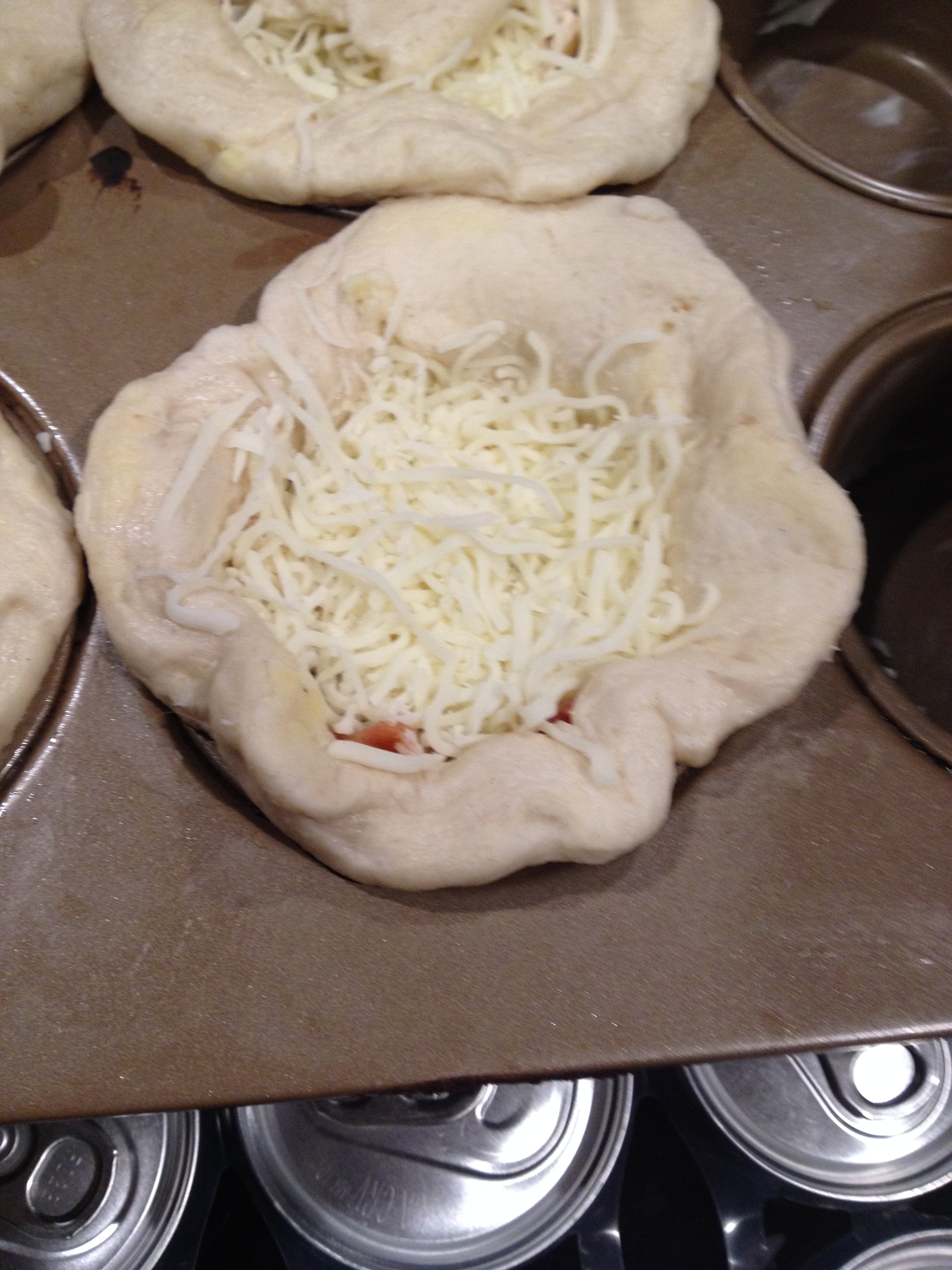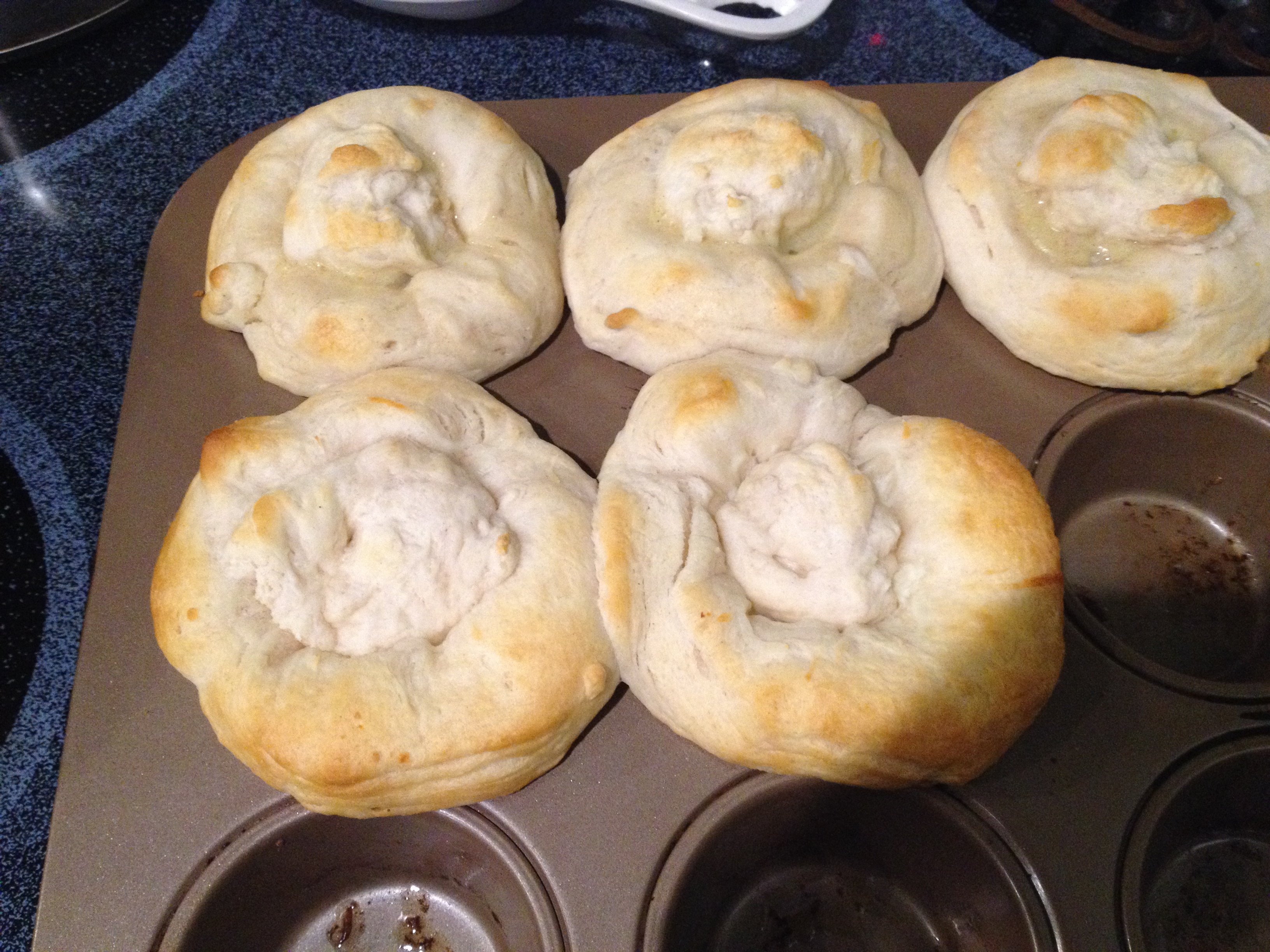 Place each biscuit in a muffin tin. You have to press it down and bring the sides up to make a crust. Then cook the soup for a few minutes until hot and spoon the filling into each biscuit cup. I then took one biscuit and cut it into pieces and made tops for each pot pie. Cook for 25-30 minutes or until crust is golden brown.